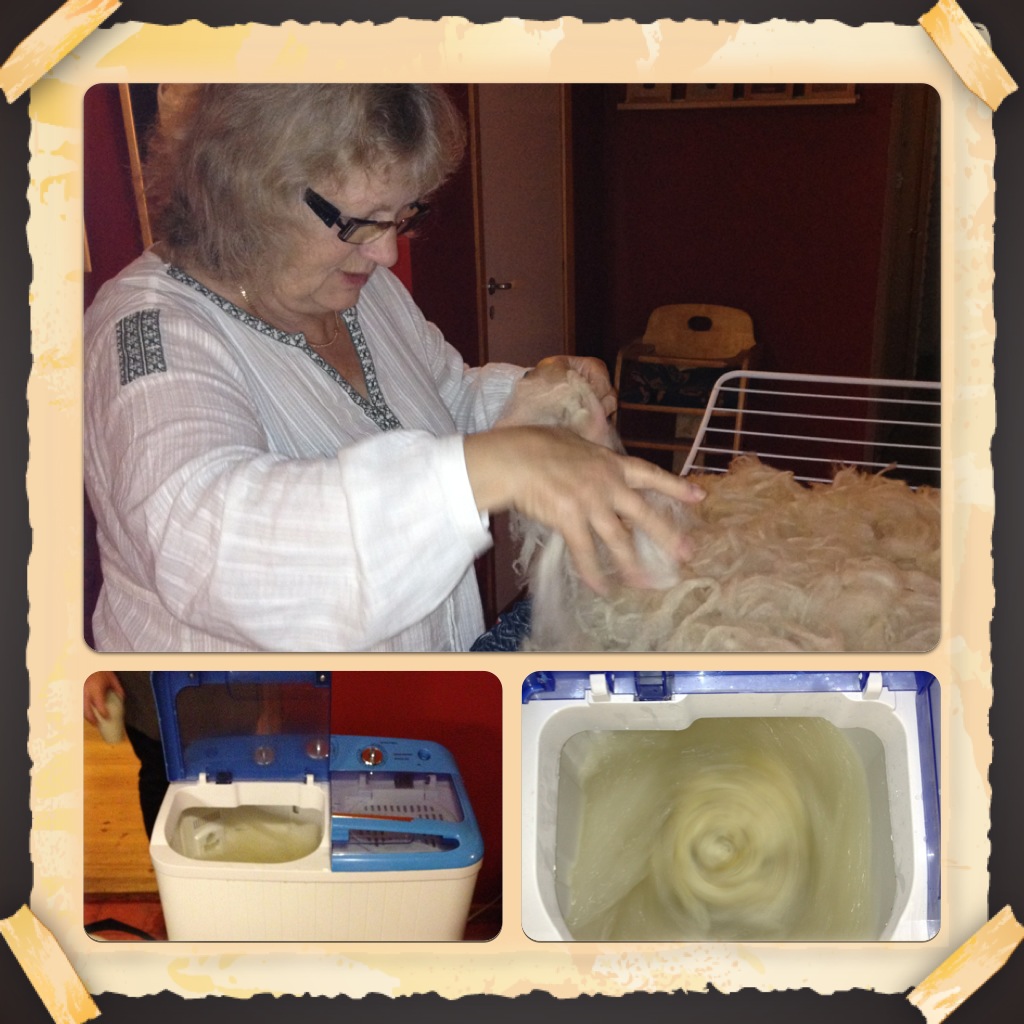 The special washing machine I bought in the Netherlands had to be tried out as well and the wool (Texel) came out a bit felted and Rose-Marie helped me by pulling out everything: